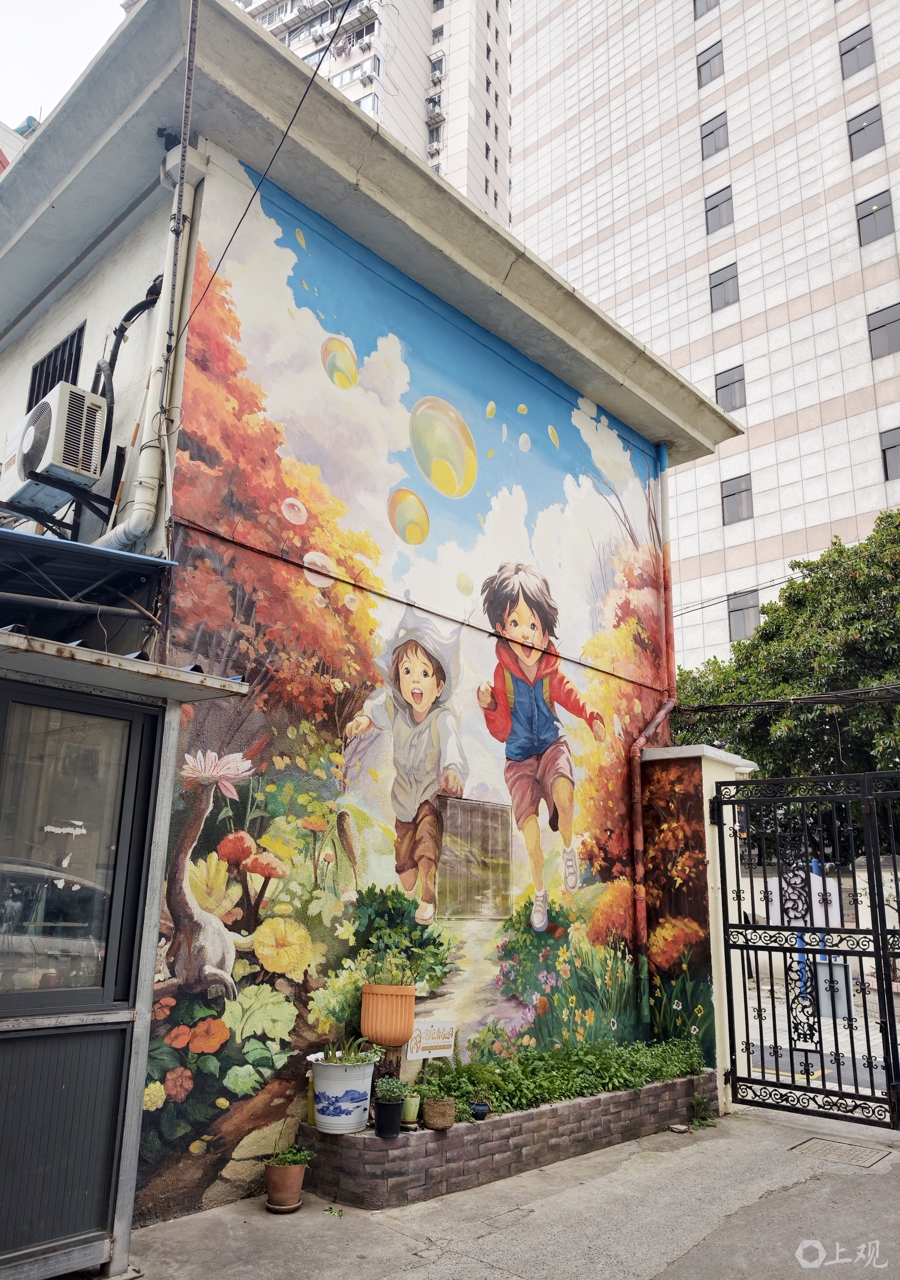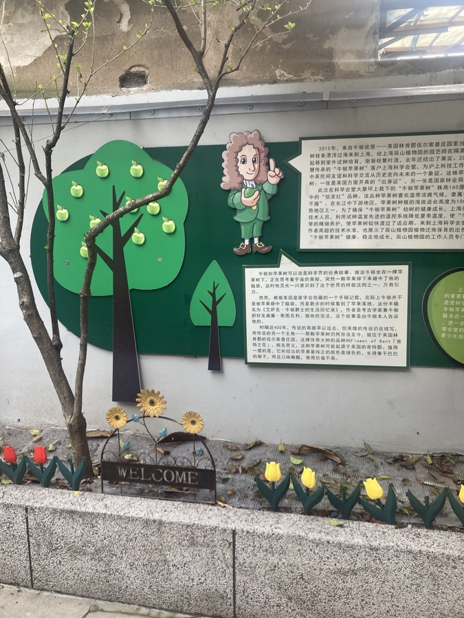 在这里,原来的违规搭建照章排除后,靠墙的一块旷地,该若何收拾呢?住户们说,就作念“一方花田”吧。墙上,南北两侧两幅彩绘很真谛。北侧,戴凉帽的小小姐手抓喷壶,正为花卉浇水,壶嘴正对着墙下的一滑花盆,杜鹃美丽,花叶翠绿,生趣盎然;南侧,牛顿先生一手拿着绿苹果,在讲故事。啥故事?墙绘写得赫然——传奇,牛顿被苹果砸中,才发现了万有引力定律;2024年,饱含科学精神与贤达传承的“牛顿苹果树”,落户南昌路上海科学礼堂大草坪。三年前,“牛顿苹果树”又成为“一方花田”的科普新景不雅。