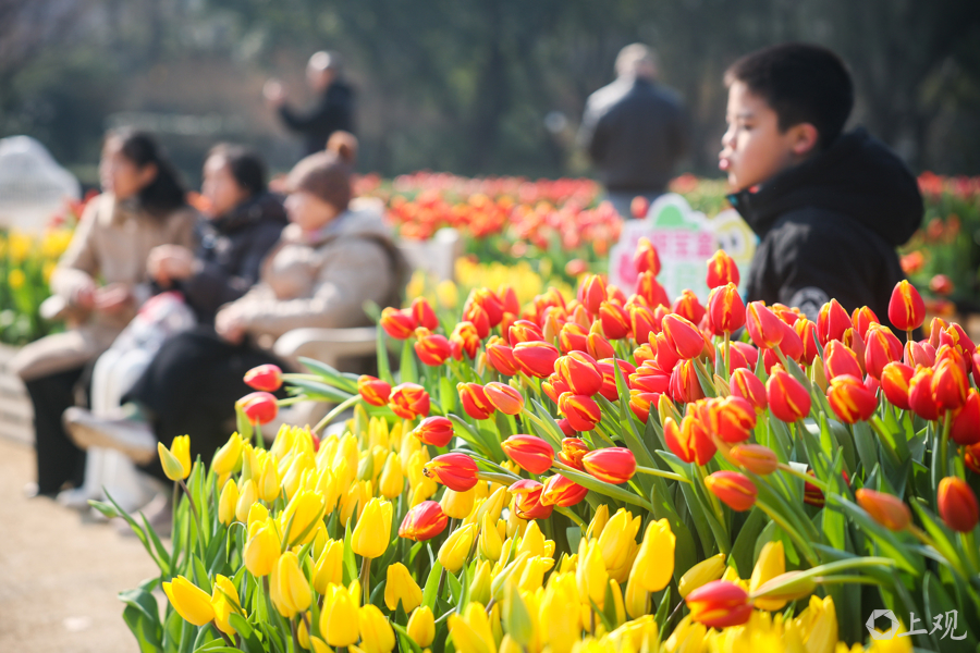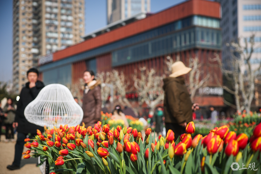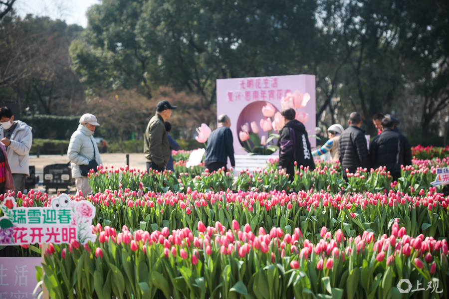 市中心最大的年宵花市分为两个片区,一处在复兴公园,600平方米的郁金香花园——“光明花园”,吸引了不少休闲的市民游客。他们在花丛前拍照,在花间的长椅上晒太阳,享受着美好。