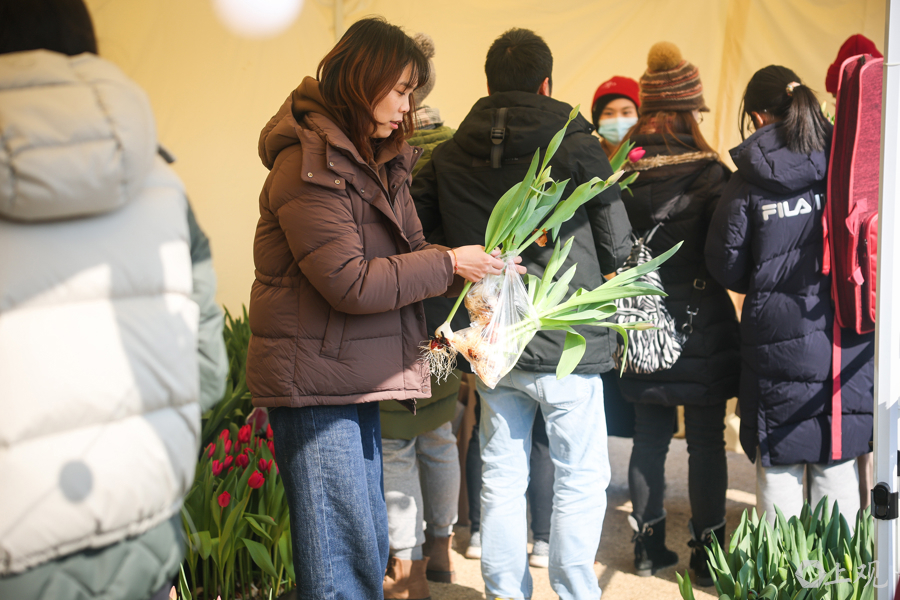 在现场,还有一片采摘区域,满是五颜六色的带球郁金香鲜花,消费者可沉浸式体验采摘的快乐。采摘10枝,29.9元,价格非常实惠。记者看到,不少拖家带口的市民游客,在这片区域采摘地乐此不疲。工作人员说,消费者可以带走的不仅仅是10枝鲜花,而且是带球根、可以回家直接水培、最大程度延长花期的花束。