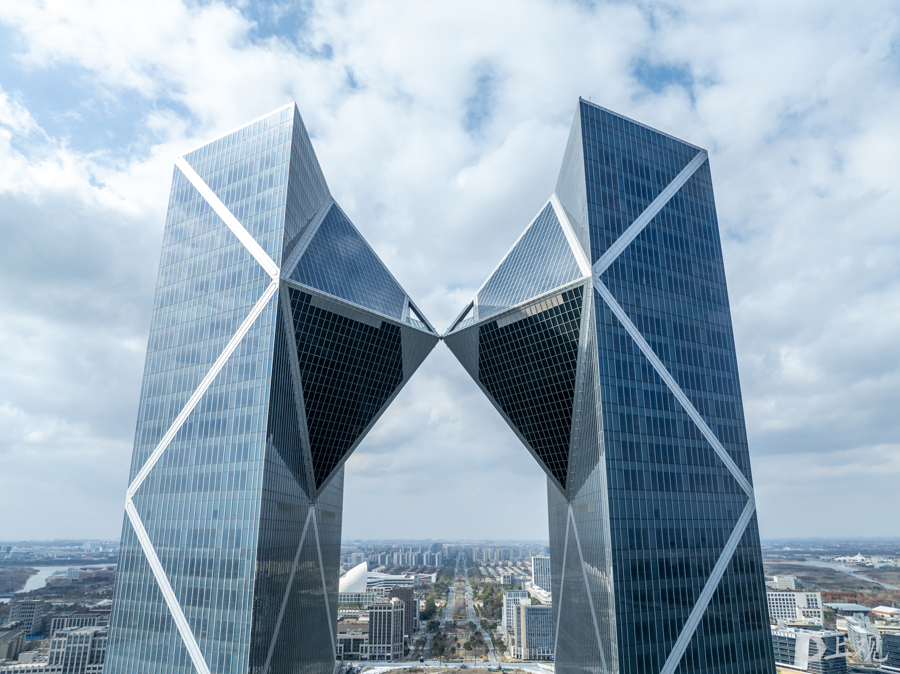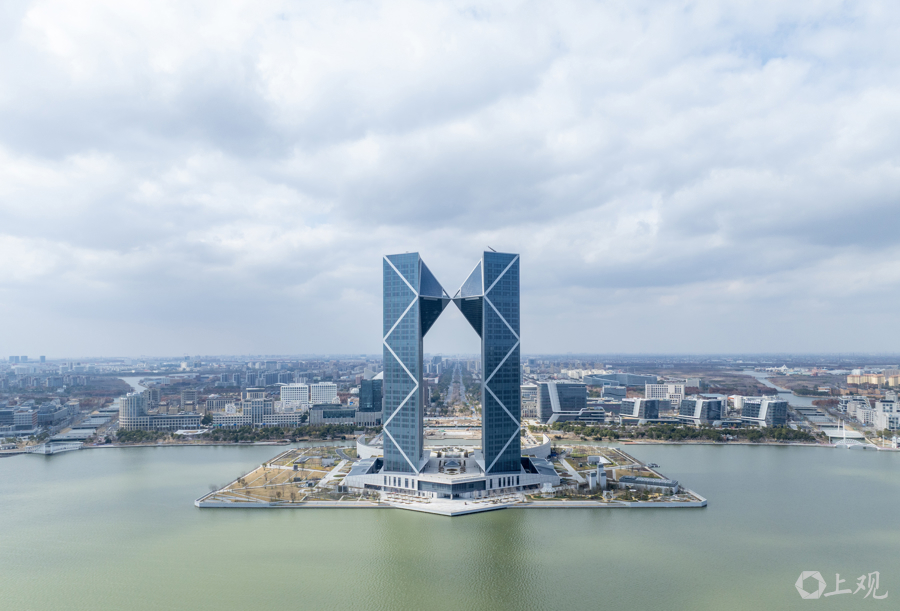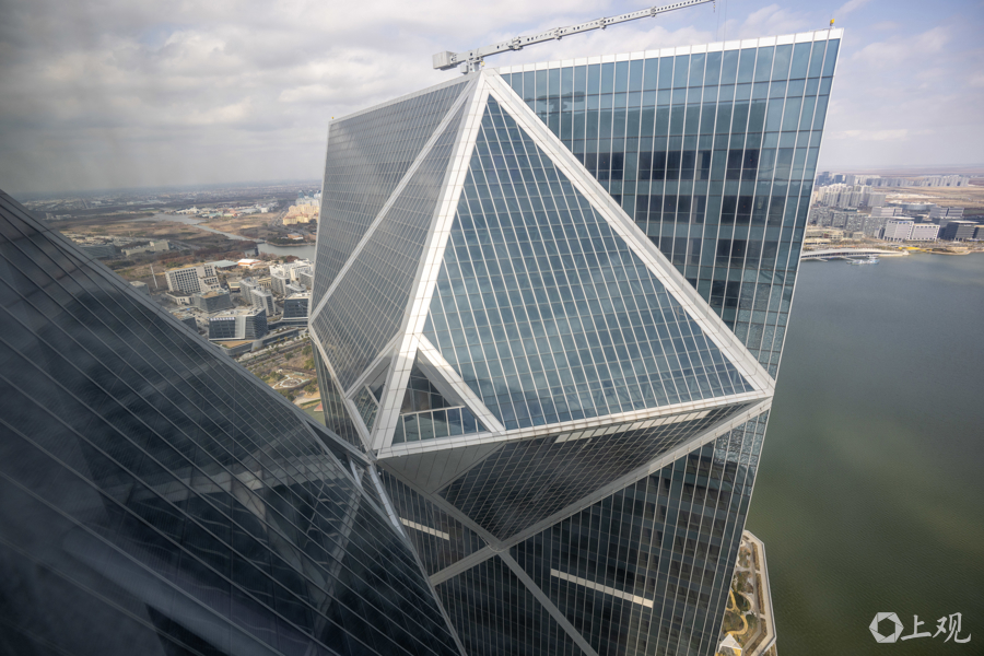 作为当前临港新片区最高标志性建筑,该项目位于滴水湖西岛屿,总建筑面积达28.25万平方米,建筑主体由两栋高195米的双子塔楼组成。