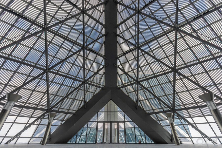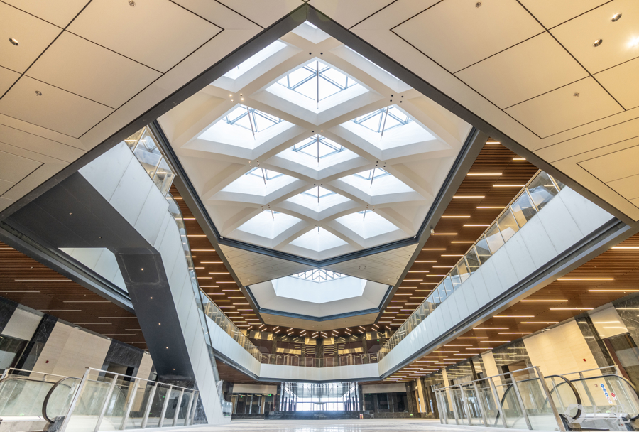 内部大堂的多线条与菱形装饰与外立面的菱形设计相呼应。