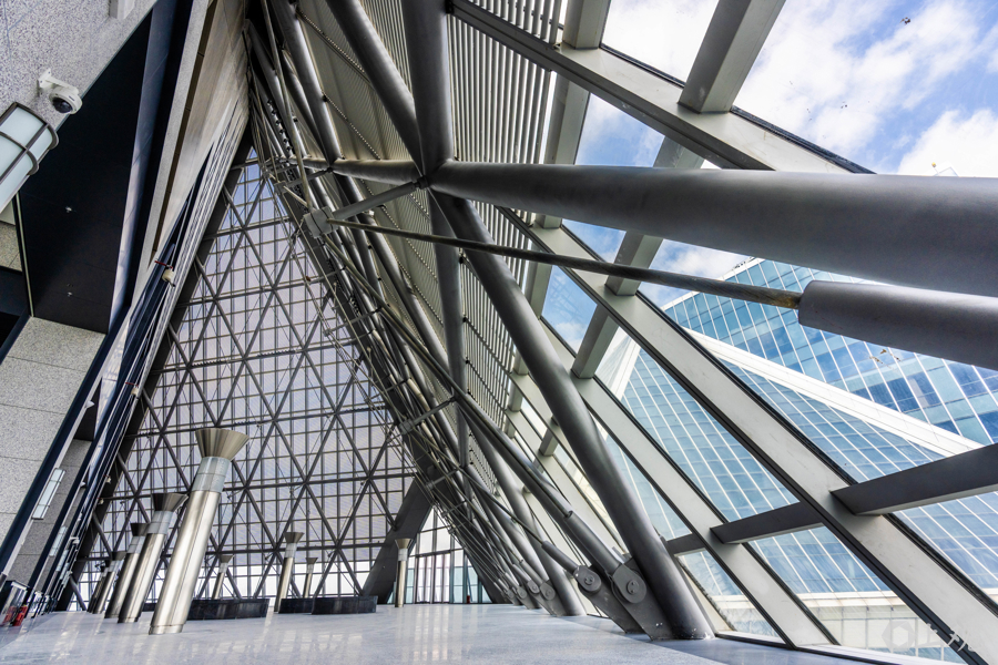 链接南北塔楼的锥形结构内部空间。锥形玻璃幕墙与钢结构的组合极具未来感。