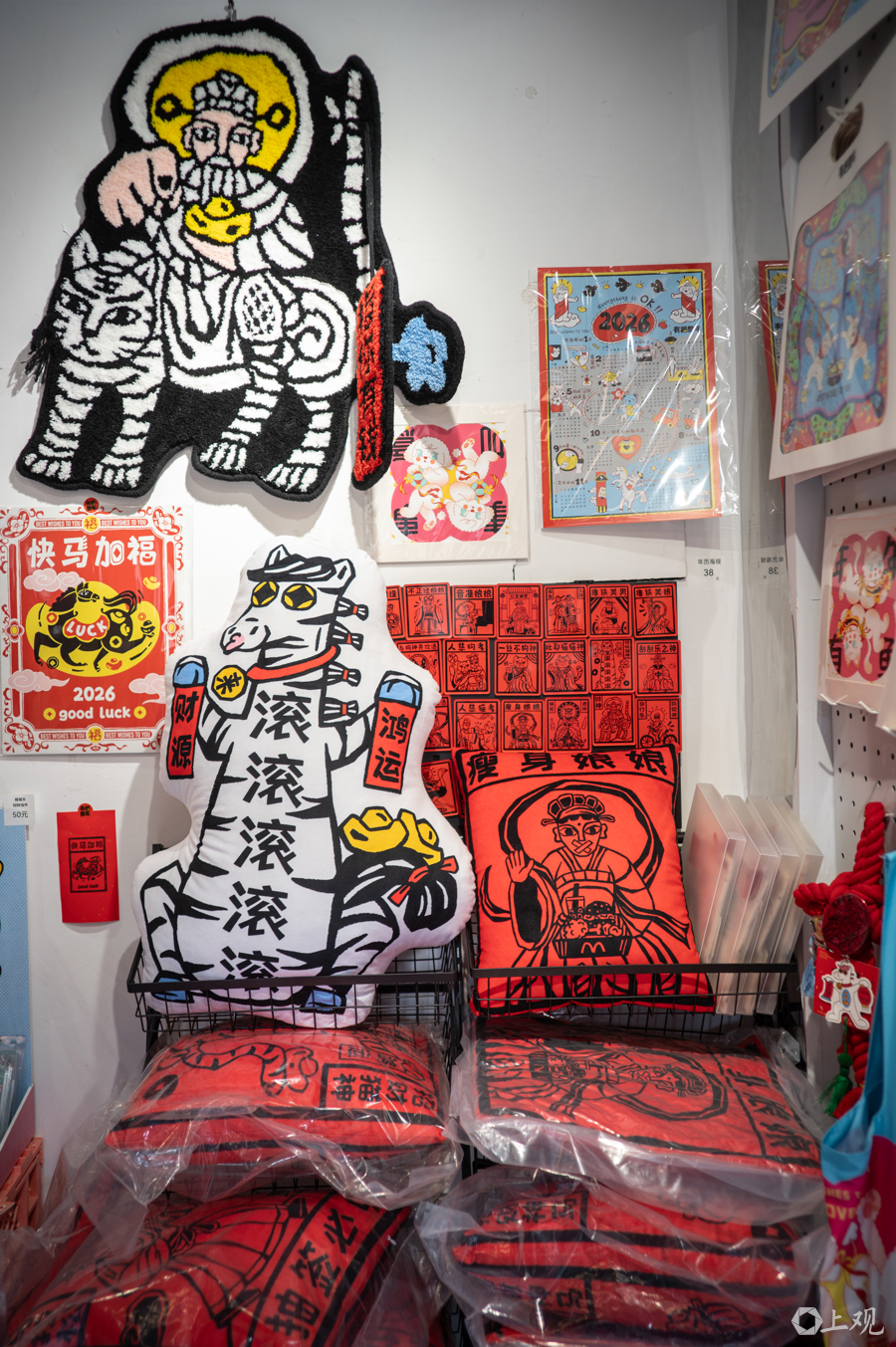 走进愚园路1046号的故事商店,“有福整年”快闪空间堪称马年新春的“文化地标”。门口昂首挺立的“福气马”装置格外吸睛,绒面材质搭配红金配色,憨态可掬的造型引得亲子家庭纷纷驻足合影。店内,独立插画师安夏打造的“快马加福系列”“福气马系列”年画插画铺满墙面,闽南传统年画纹样中融入萌趣宠物形象,既保留传统韵味,又充满年轻活力。