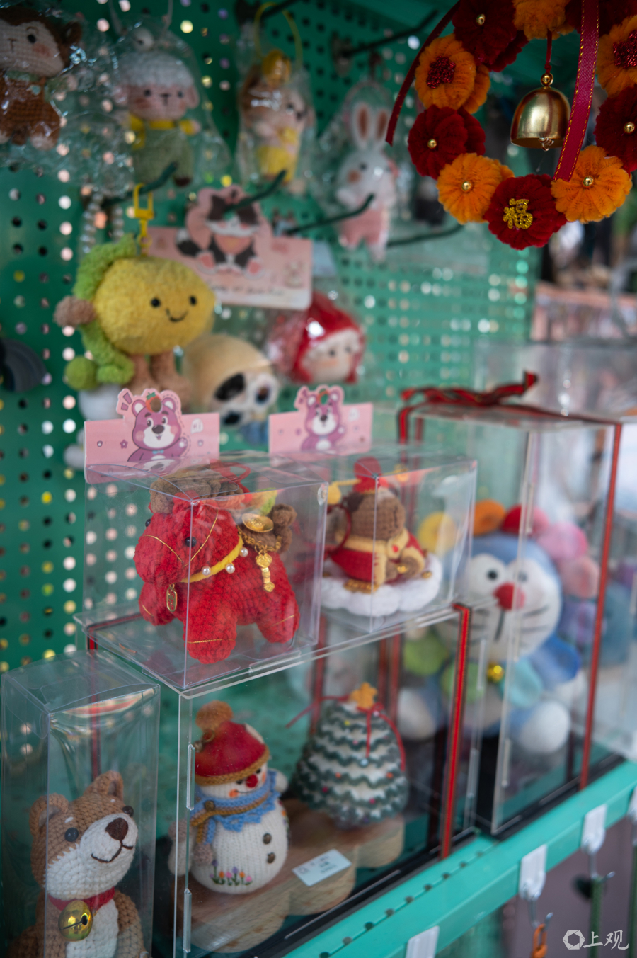 门口,一个毛绒钩针玩具的摊位格外吸睛,各种动漫形象、马年主题的毛绒玩具吸引了不少路人的驻足。
