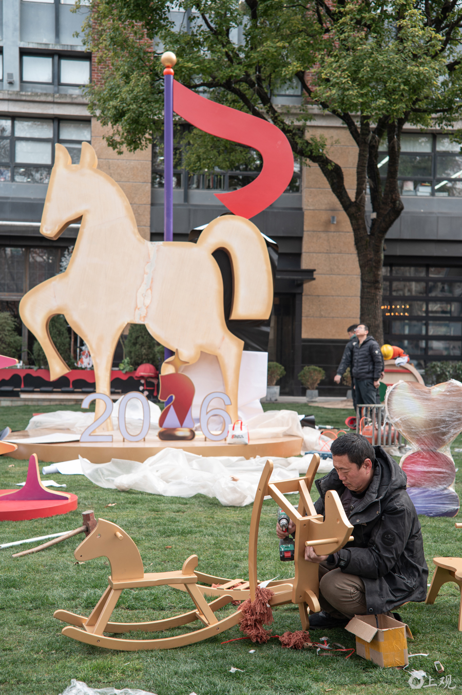 在咖啡店旁的广场上,工人师傅正在加班加点地搭建各种以马为主题,五彩缤纷的装饰,再过两天,这里将从元旦新年模式彻底转向新春马年模式。