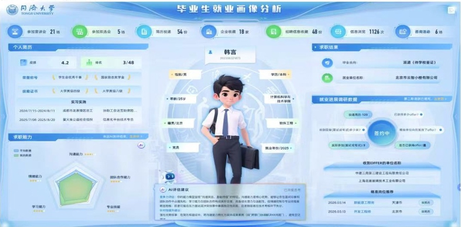 同济大学字据毕业生4年景长档案酿成的求职画像,并推送岗亭信息。