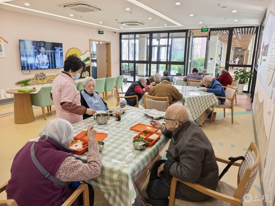华康恒裕养护院老东说念主午间就餐的场景。唐烨摄