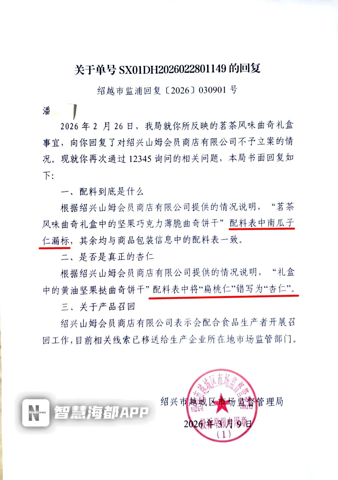 本市宝山区市集监督处置局短信回复潘先生说,他们接获投诉信息后,立即对山姆会员店宝山店开展现场查验,并对涉事“茗茶仪态曲奇礼盒”的标签合规性、原料使用情况进行打听核实,“对投诉中被投诉东说念主涉嫌销售不稳当食物安天下度次序的活动,经核查属实已立案打听。”