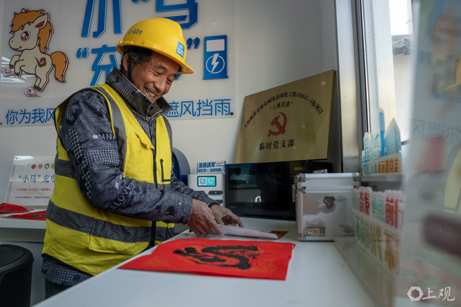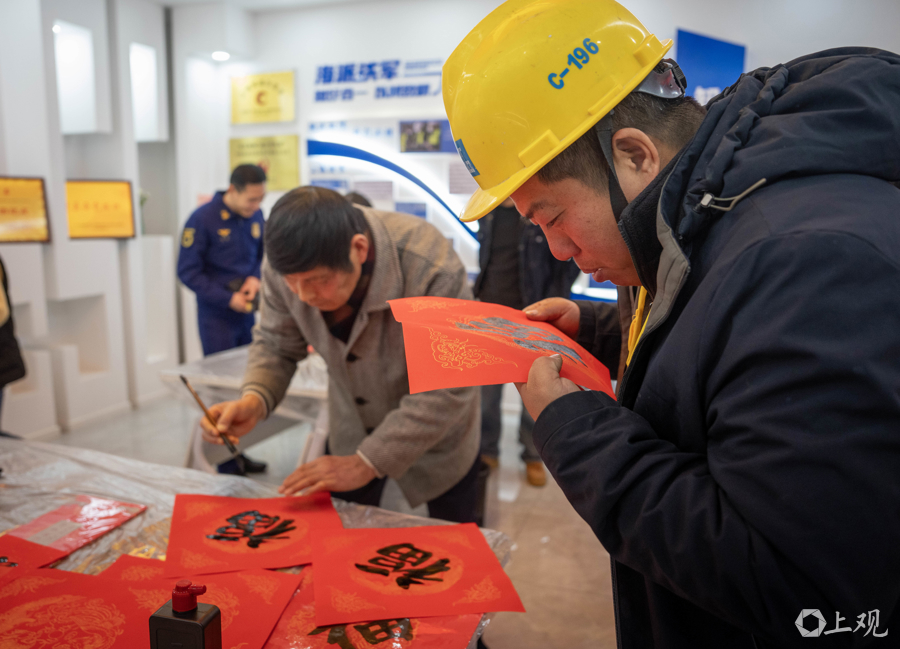 工友们将书法老师们刚写的“福”字小心翼翼地保存起来,准备带回老家。