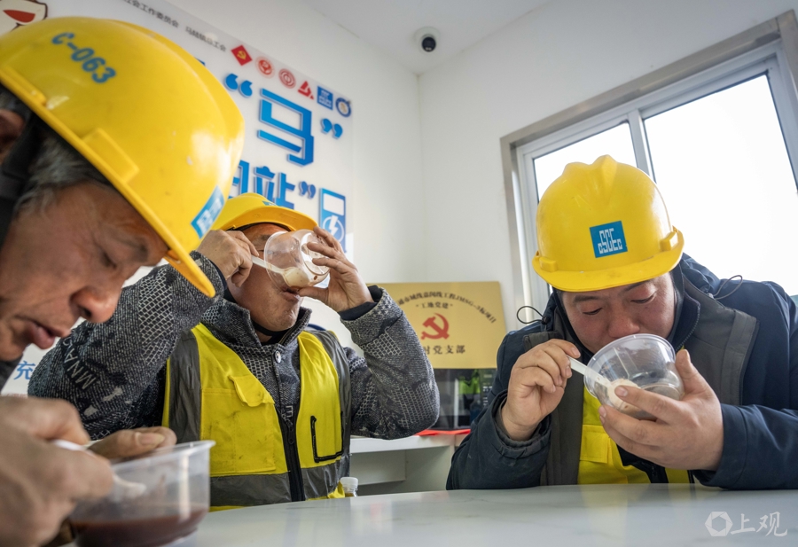 刚出锅的腊八粥格外香甜,工友们一饮而尽。