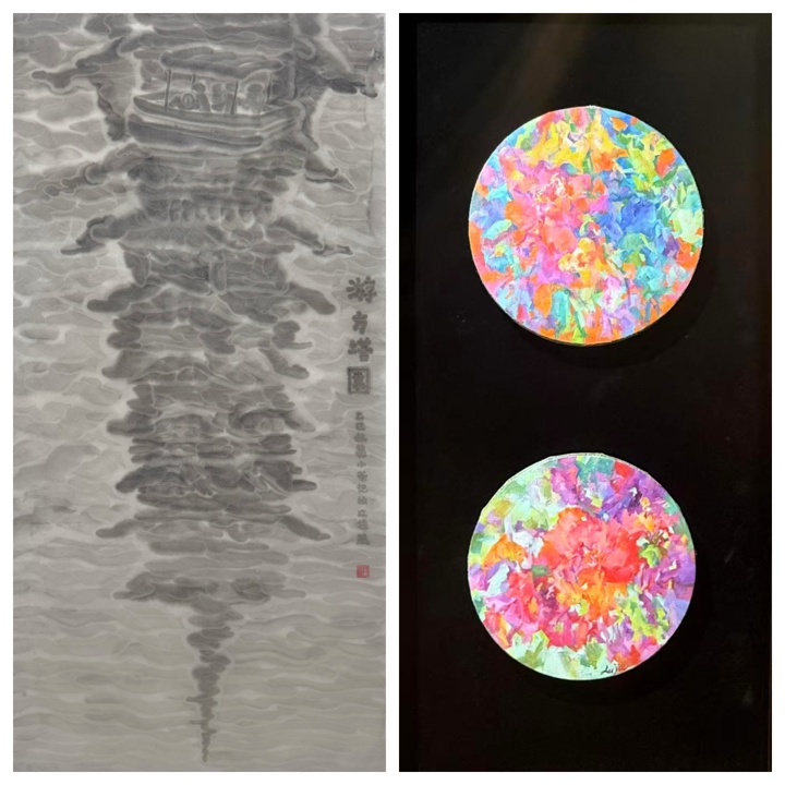 左:《游方塔园》莫小茶 70x35cm 纸本水墨 2025 右:徐洁《知止》 ,86×40CM,2025年
