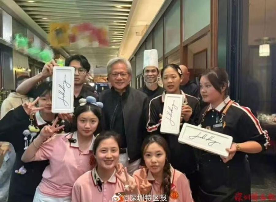 此时,黄银洛与同事们按捺不住,过来请求与黄仁勋合影留念。黄仁勋很痛快地一口答应,还应邀在三个餐盘上签字留念,连声称赞深圳的牛肉既新鲜、又好吃,表示有机会还会再来。