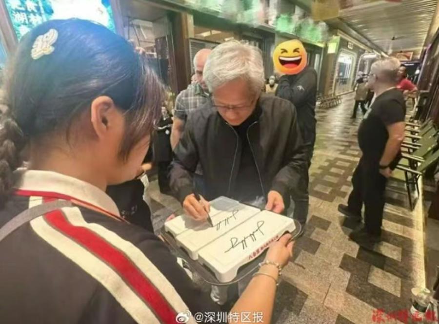 黄仁勋还掏出一个红包,签名之后递给徐女士,里面有600元,随后一行人进入菜市场消费,不少路人认出后跟随。“这两天还专门有不少人慕名来店内消费,客流量增加了不少。”