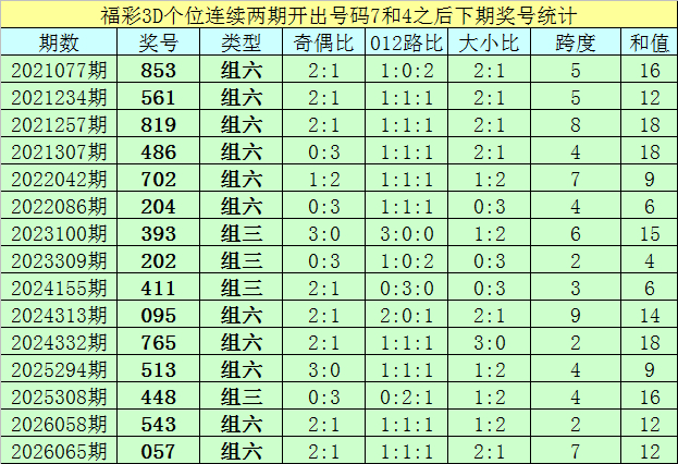 个位号码:最近两期个位开出号码为7-4,在福彩3D历史开奖中,前后两期个位离别开出号码7-4的奖号出现了88次。最近15期个位7-4组合出现之后,其下期奖号离别为:853-561-819-486-702-204-393-202-411-095-765-513-448-543-057;